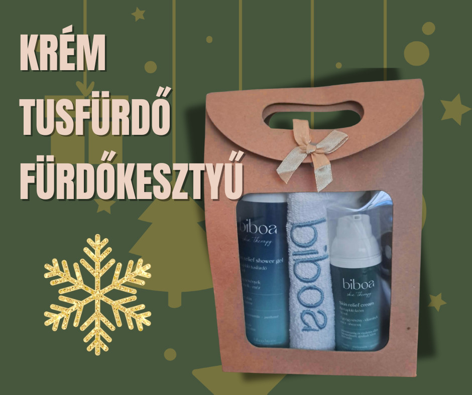 Ajándékcsomag tartalma: - 1 db biboa bőrtápláló tusfürdő 200ml - 1 db biboa bőrtápláló krém 50 ml - 1 db fürdőkesztyű biboa hímzéssel, frottír - barna színű ajándéktasak (papír) BIBOA - Ekcémára, száraz bőrre kifejlesztett natúrkozmetikumok