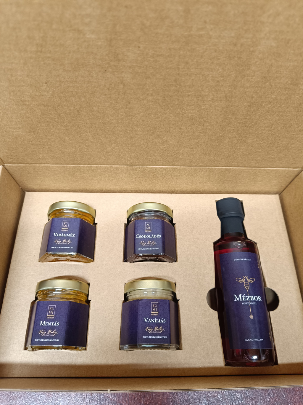 A doboz tartalma 4*50g virágméz, csokoládés -, mentás-, vanilíás mézkészítmény 100 ml Feketeribizlis mézbor