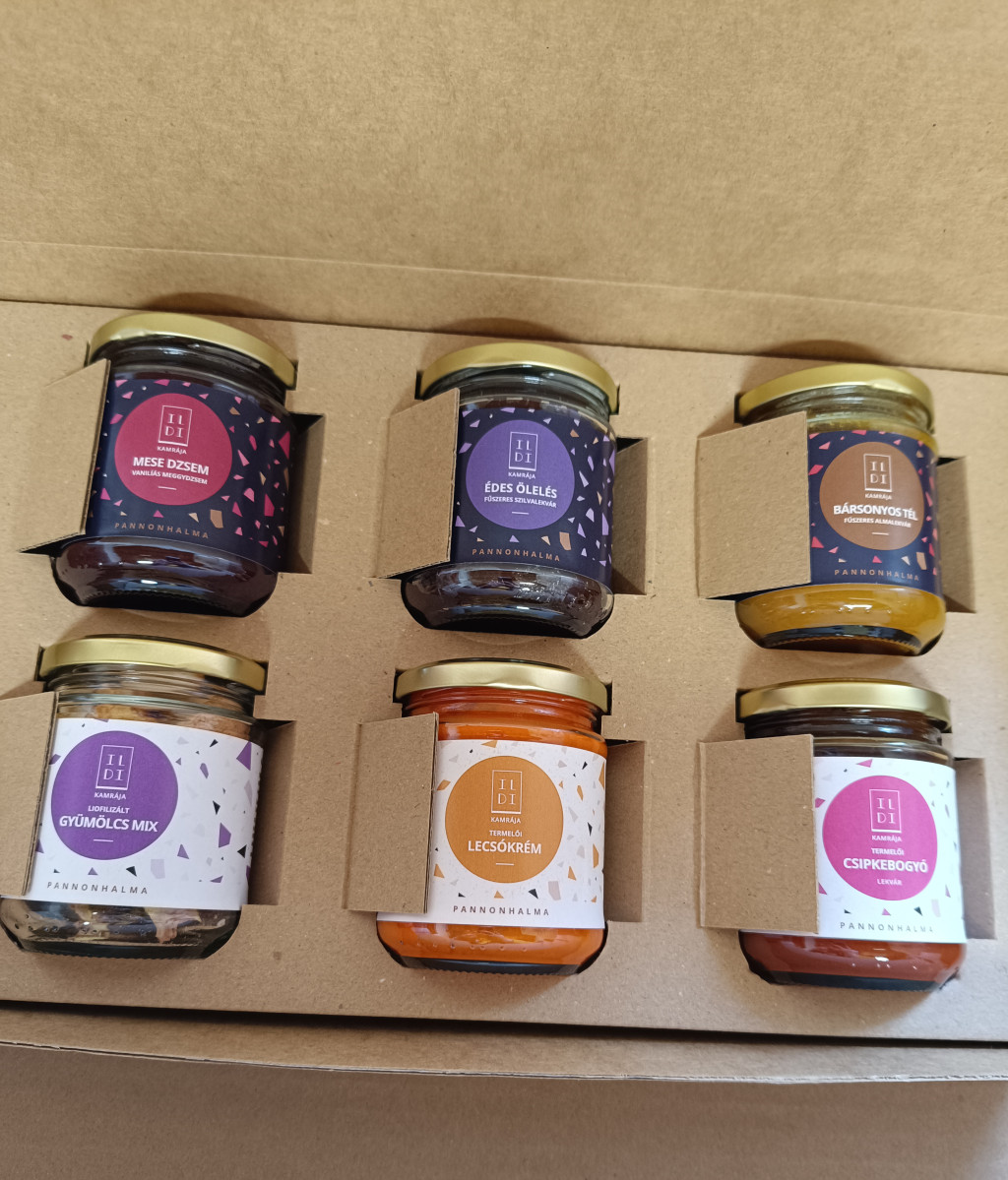 A doboz tartalma: 212 mi Vaníliás, tonkababos meggydzsem. 212 ml Fűszeres szilvalekvár 212 ml Narancsos, fűszres almalekvár 212 ml Lecsókrém 212 ml.Csipkebogyólekvár 212 ml Liofilizált füge, körte, szilva. Tartósítószert nem tartalmaz egyik termék sem!