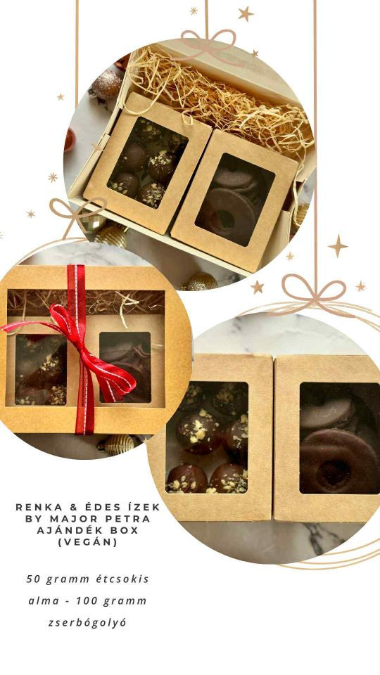Renka & Édes Ízek By Major Petra vegán ajándék box, a csomag tartalma: 100 gramm zserbógolyó 50 gramm étcsokis alma
