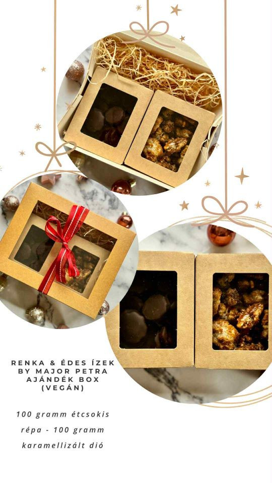 Renka & Édes Ízek By Major Petra vegán ajándék box, a csomag tartalma: 100 gramm karamellizált dió 100 gramm étcsokis répa