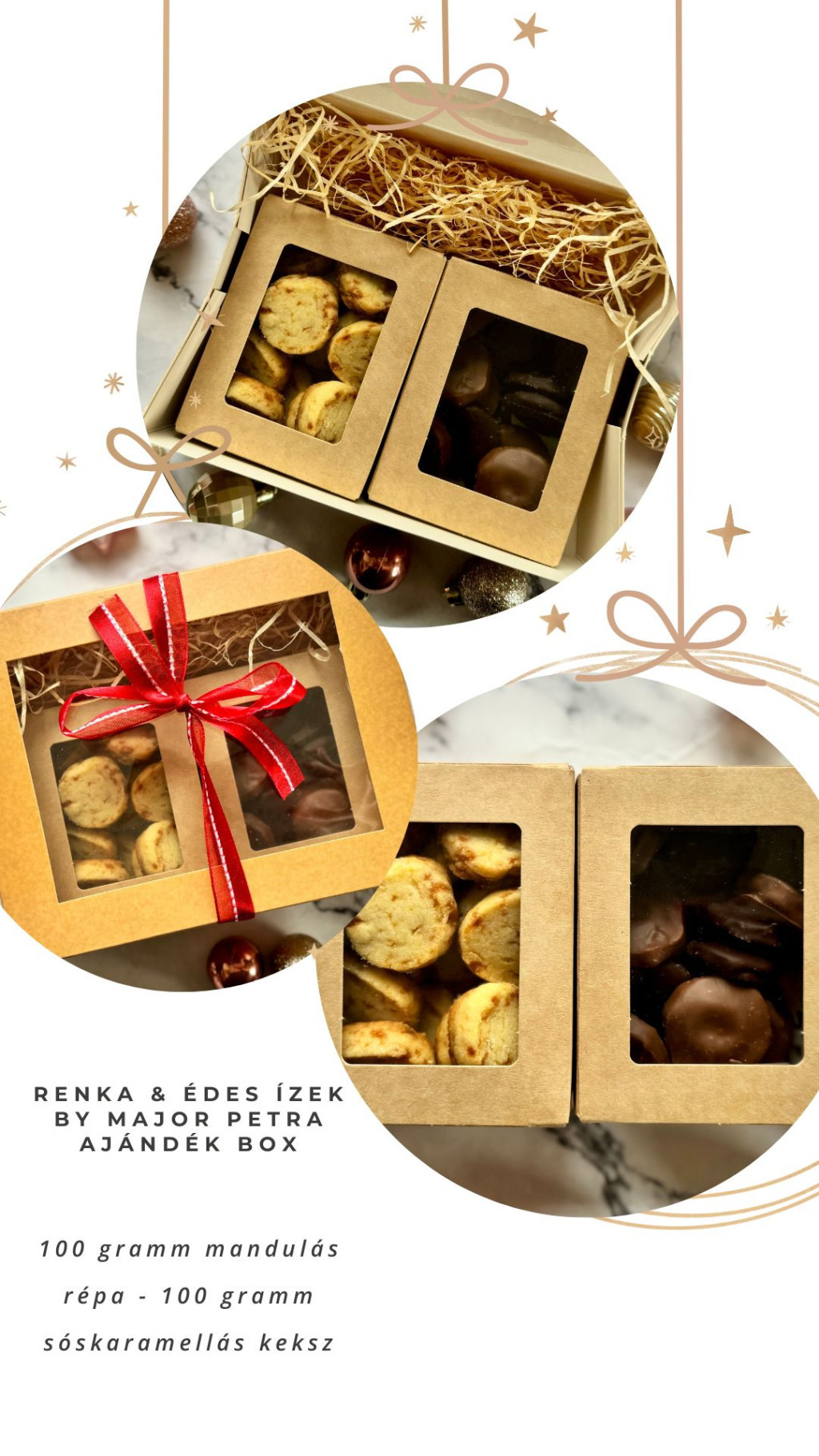 Renka & Édes Ízek By Major Petra ajándék box, a csomag tartalma: 100 gramm sóskaramellás keksz 100 gramm mandulás répa
