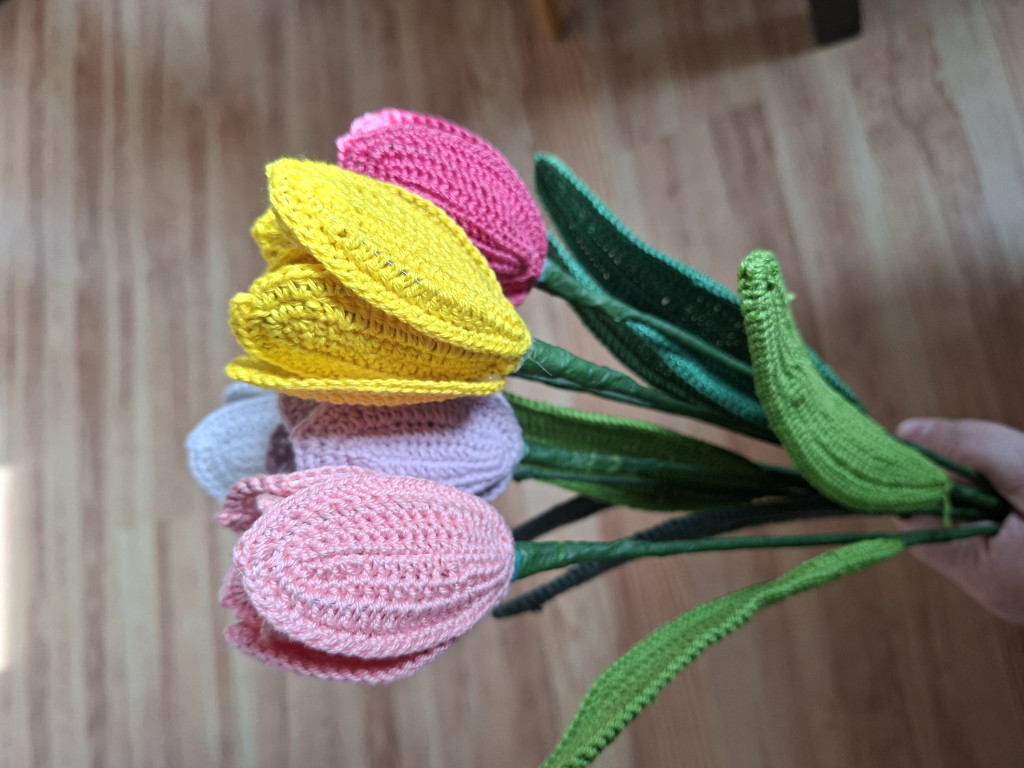 Horgolt tulipán vegyes színben, drót szárral. Az ár egy szálra érvényes.