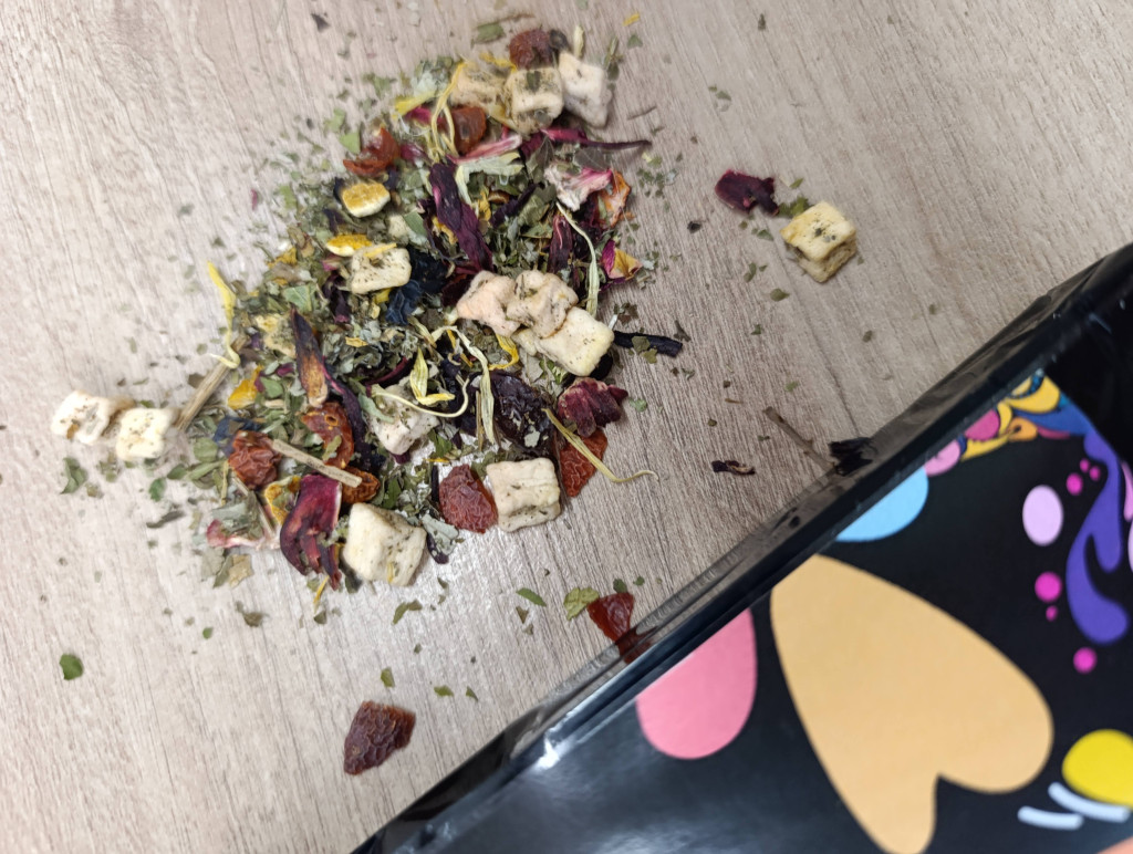 Összetétel: csipkehús, alma, hibiszkuszvirág, fekete bodza, borsmenta, málnalevél, ánizsmag, köménymag, szederlevél, eperlevél, mogyorólevél, narancshéj, körömvirág szirom, napraforgóvirág szirom, rózsaszirom, citromfű, lándzsás útifű, természetes aroma