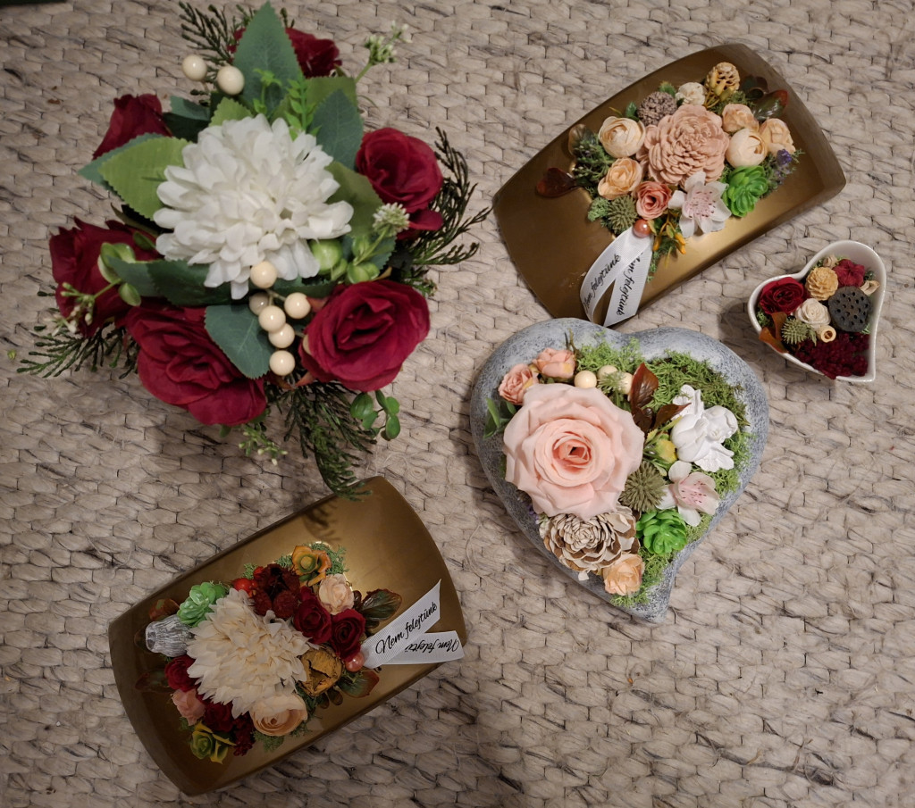 Kerámia szív formába díszített temetői dekoráció selyem virággal és száraz terméssel, dekor felirattal.