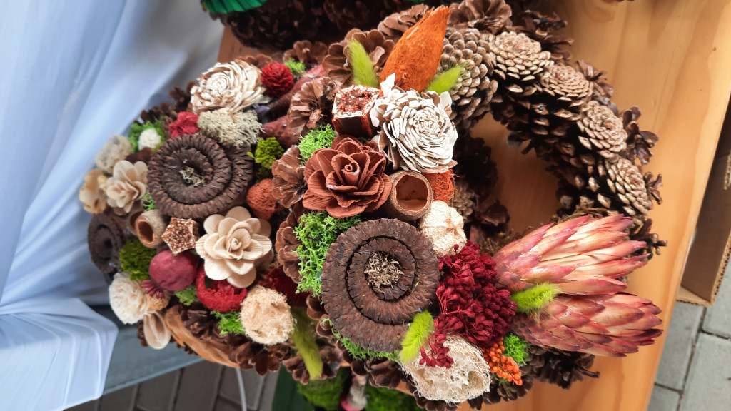 30 cm átmérőjű toboz alap száraz virággal és száraz terméssel bedíszítve